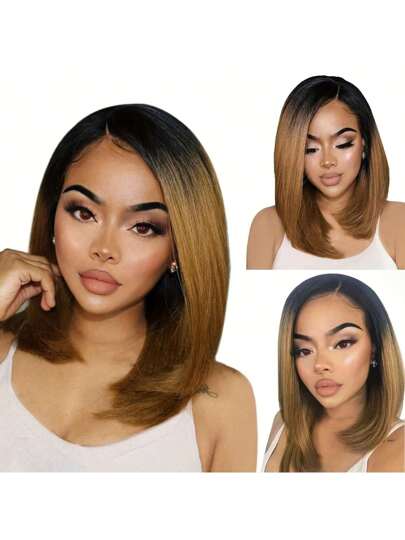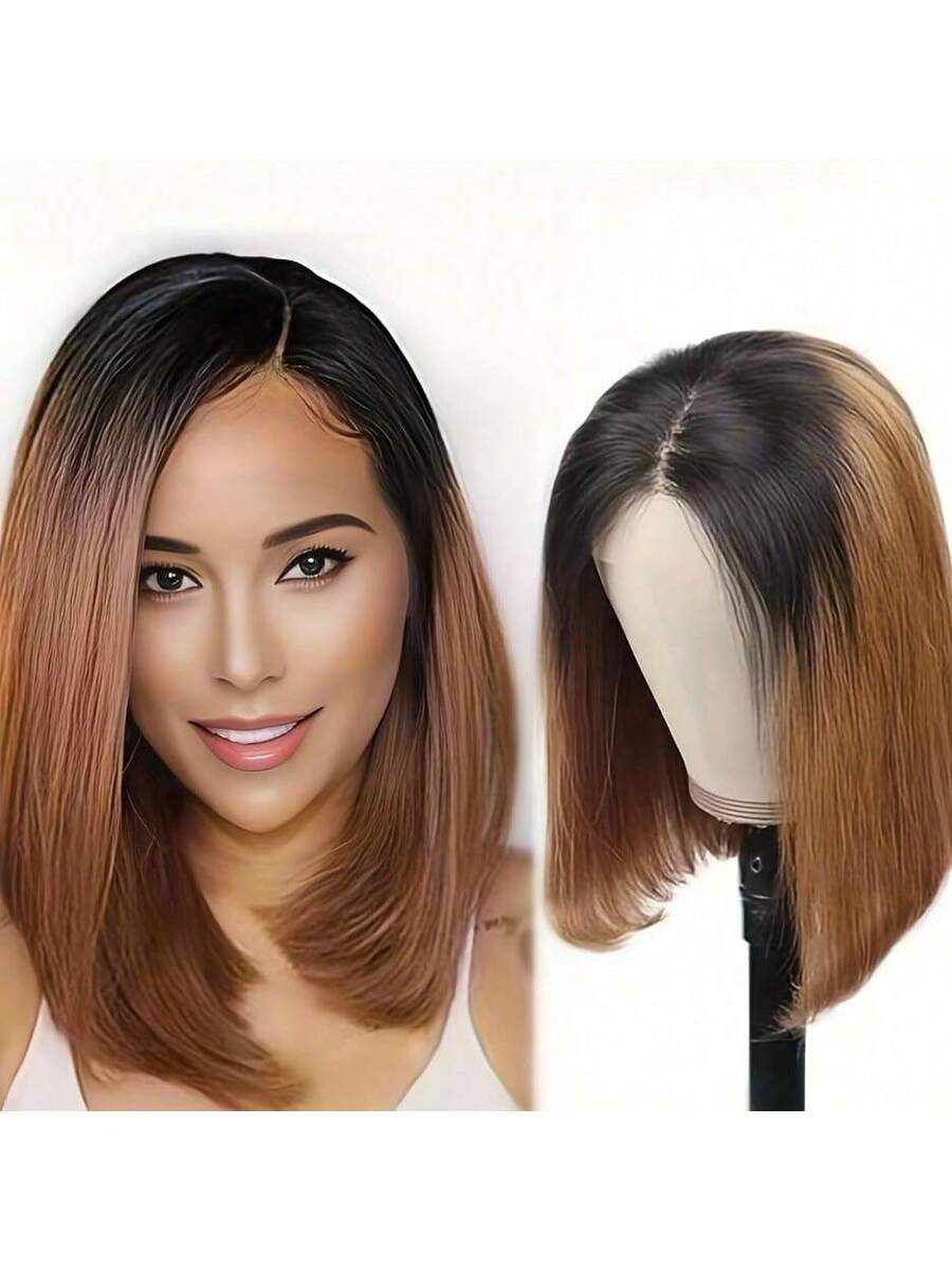 12inch Women's Shoulder-Length Gradient Brown Bob Wig - Medium Straight Natural Synthetic Fiber Heat Resistant, With Adjustable Button Cap And 130 Density, Suitable For All Skin Tones, Cosplay And Daily Wear, Fashion Hair Accessory, Ombre Gradient Wig, Stable Fit Cap