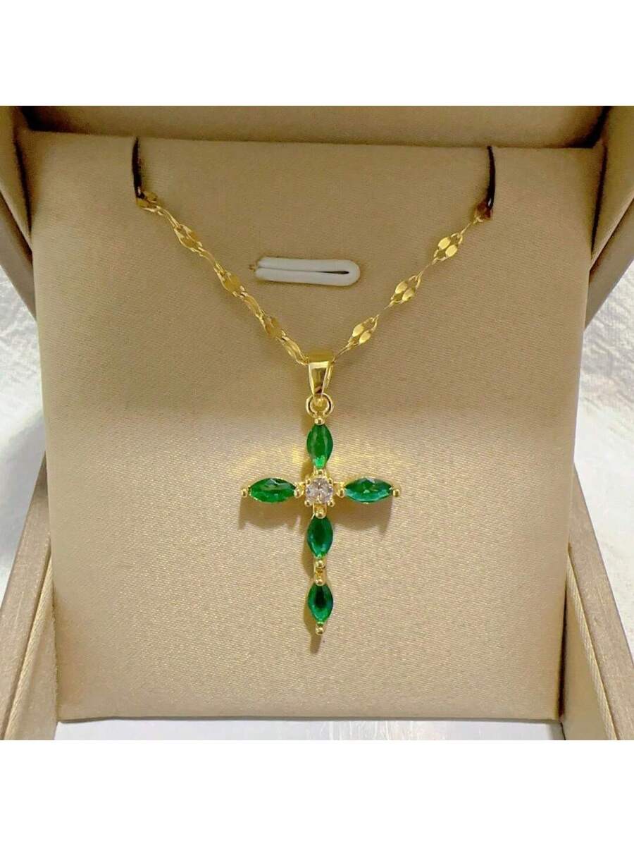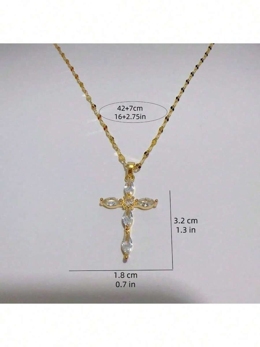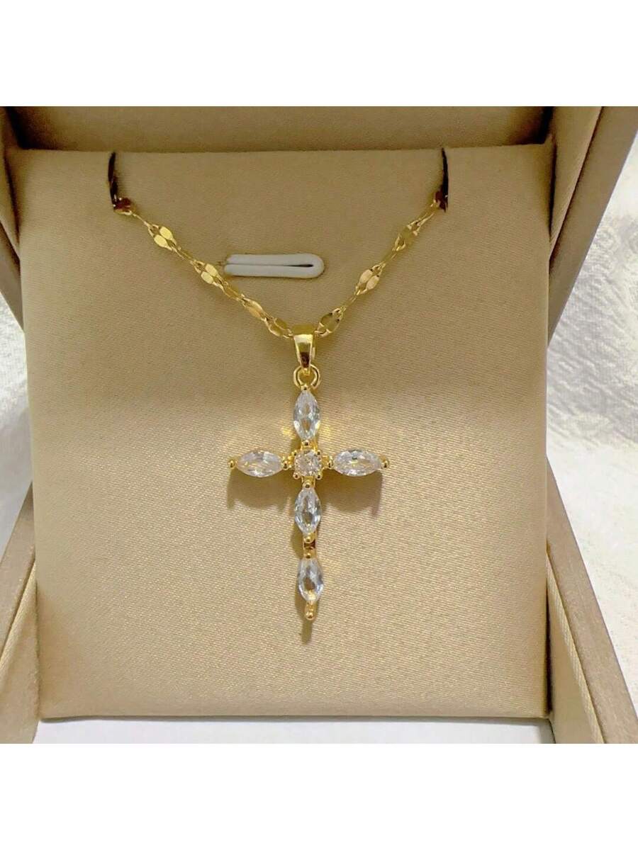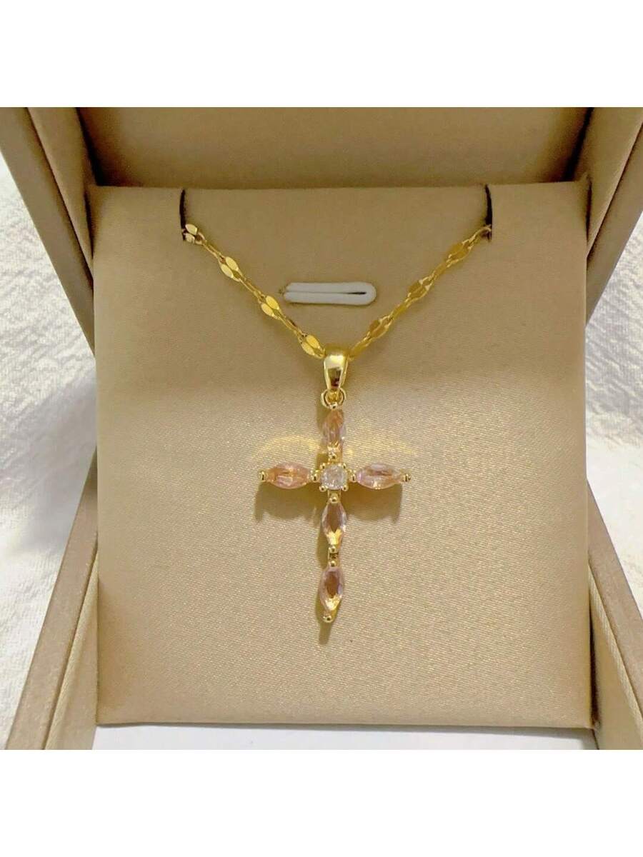 ✨ 3-Color Cubic Zirconia Cross Pendant Necklace – Gold & Copper Stainless Steel Chain Jewelry