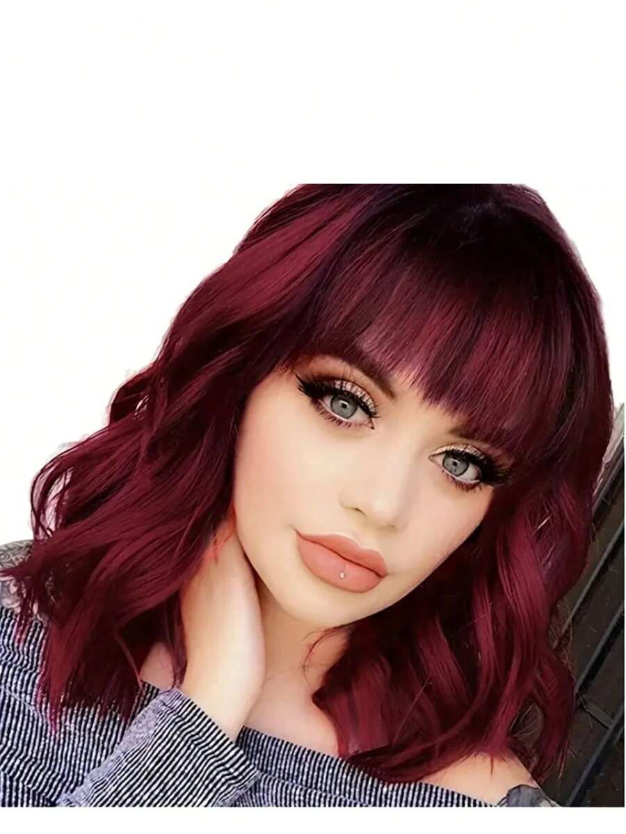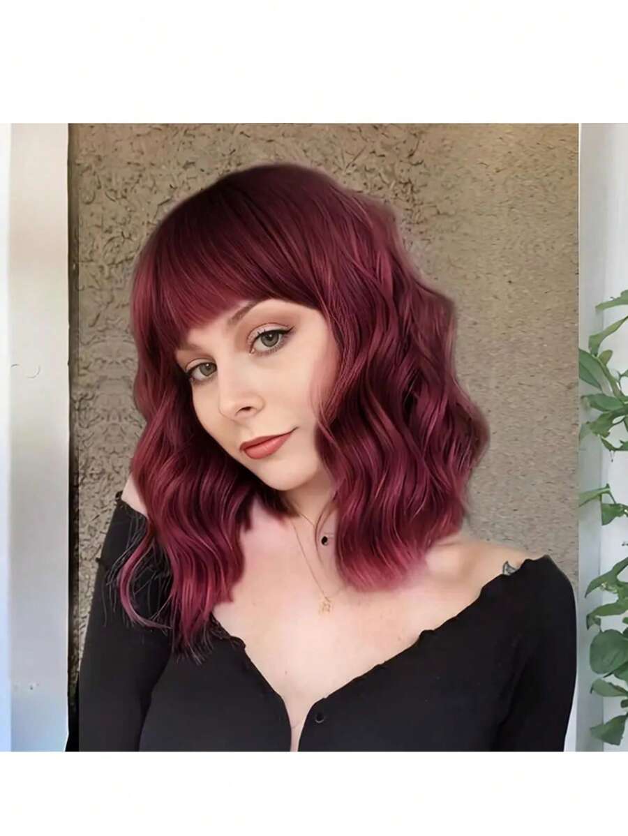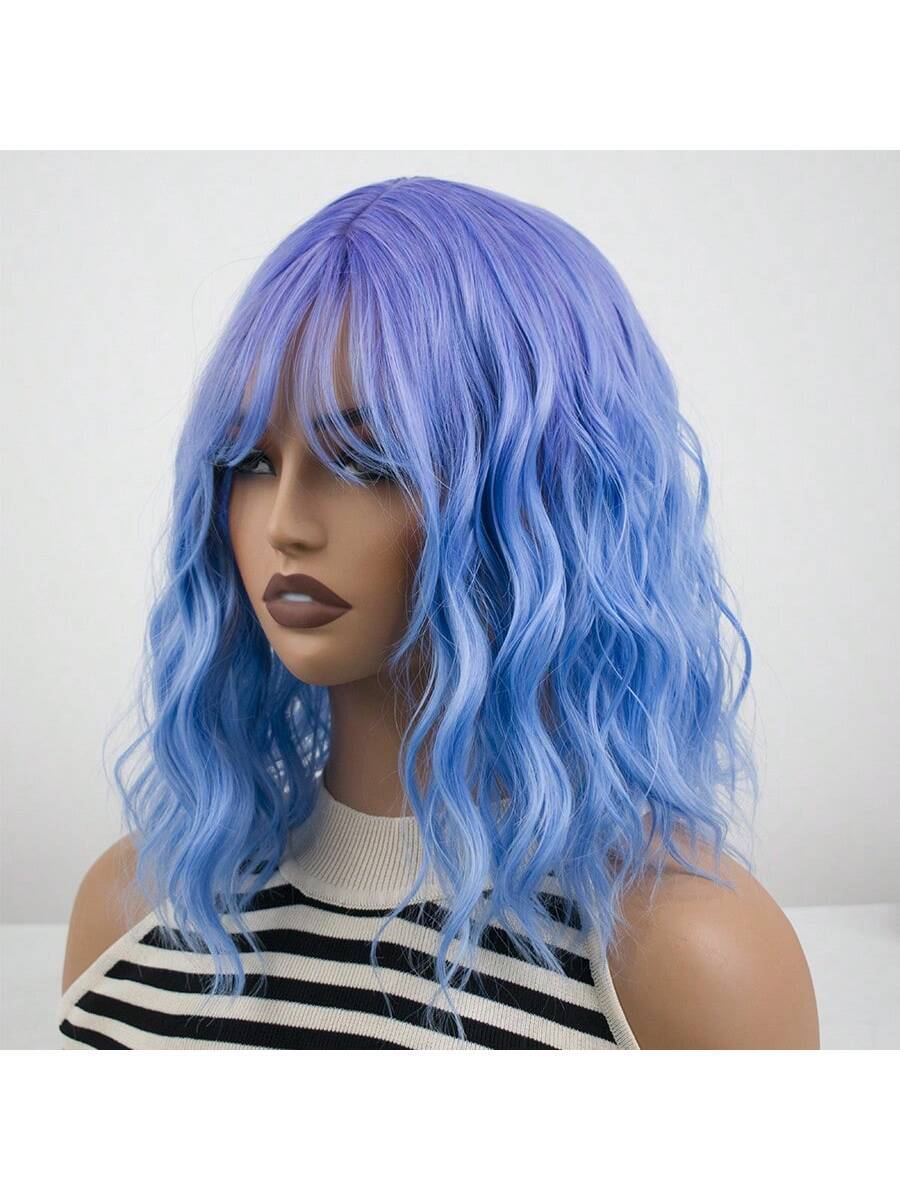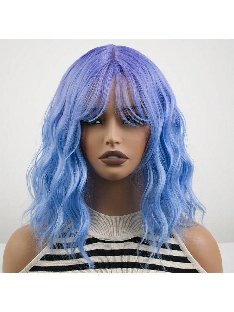 Blue Color Wigs Short Curly Wig with Bangs - 14" Matte Heat-Resistant Fiber | Breathable Rose Net Cap, Elegant Wavy Style | Perfect for Holidays & Casual Daily Wear
