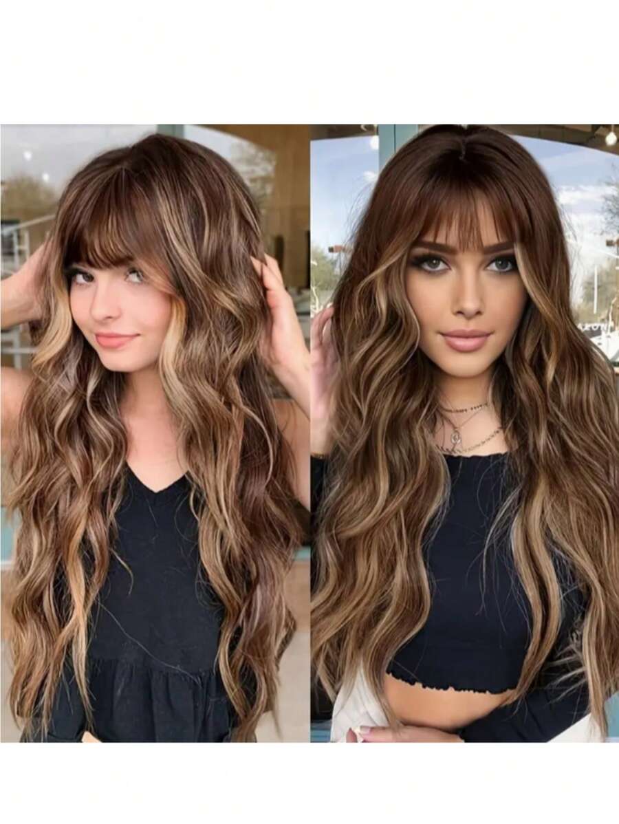 ✨ 28-Inch 3D Body Wave Synthetic Wig – Brown with Blonde Highlights & Bangs