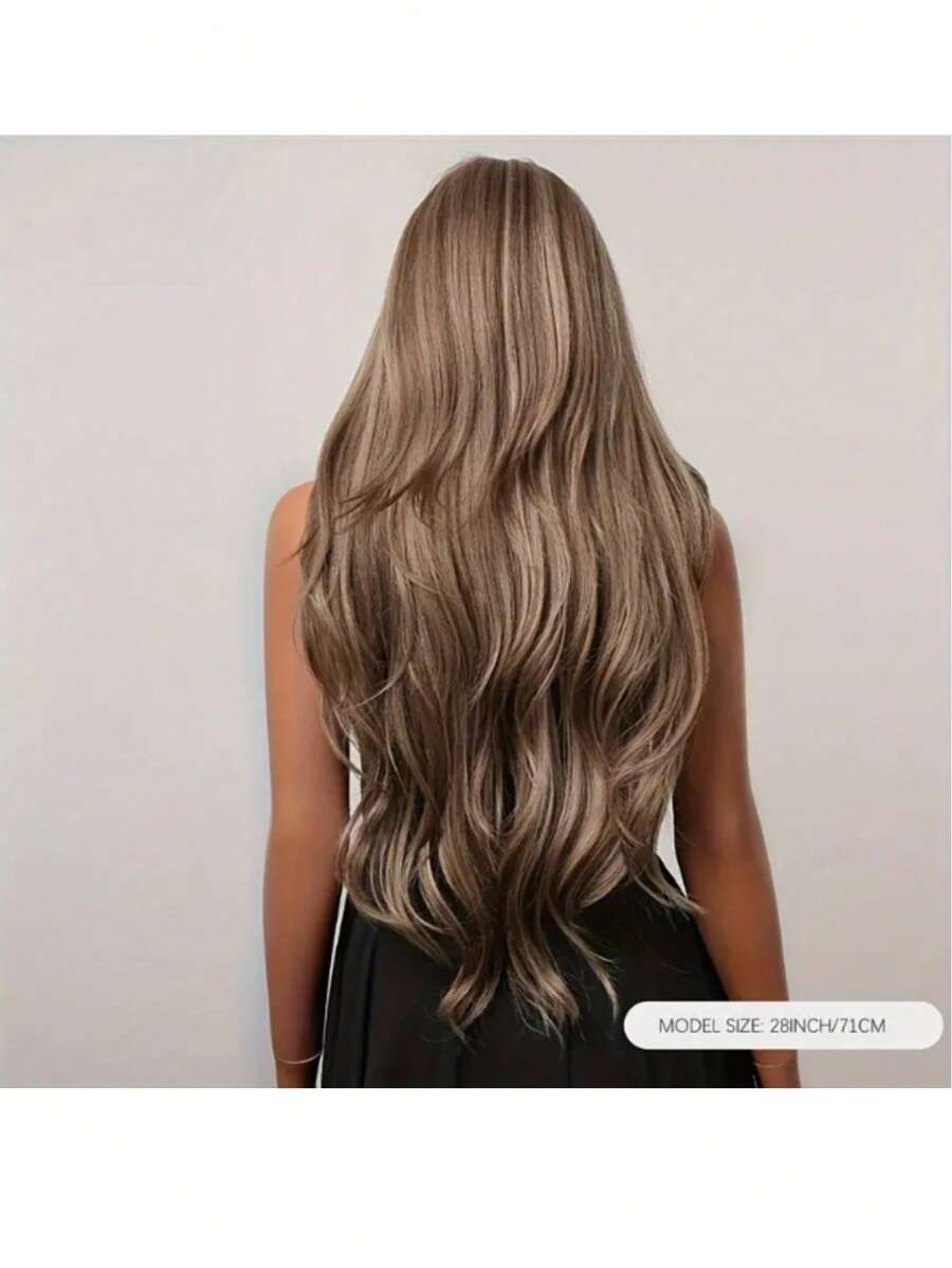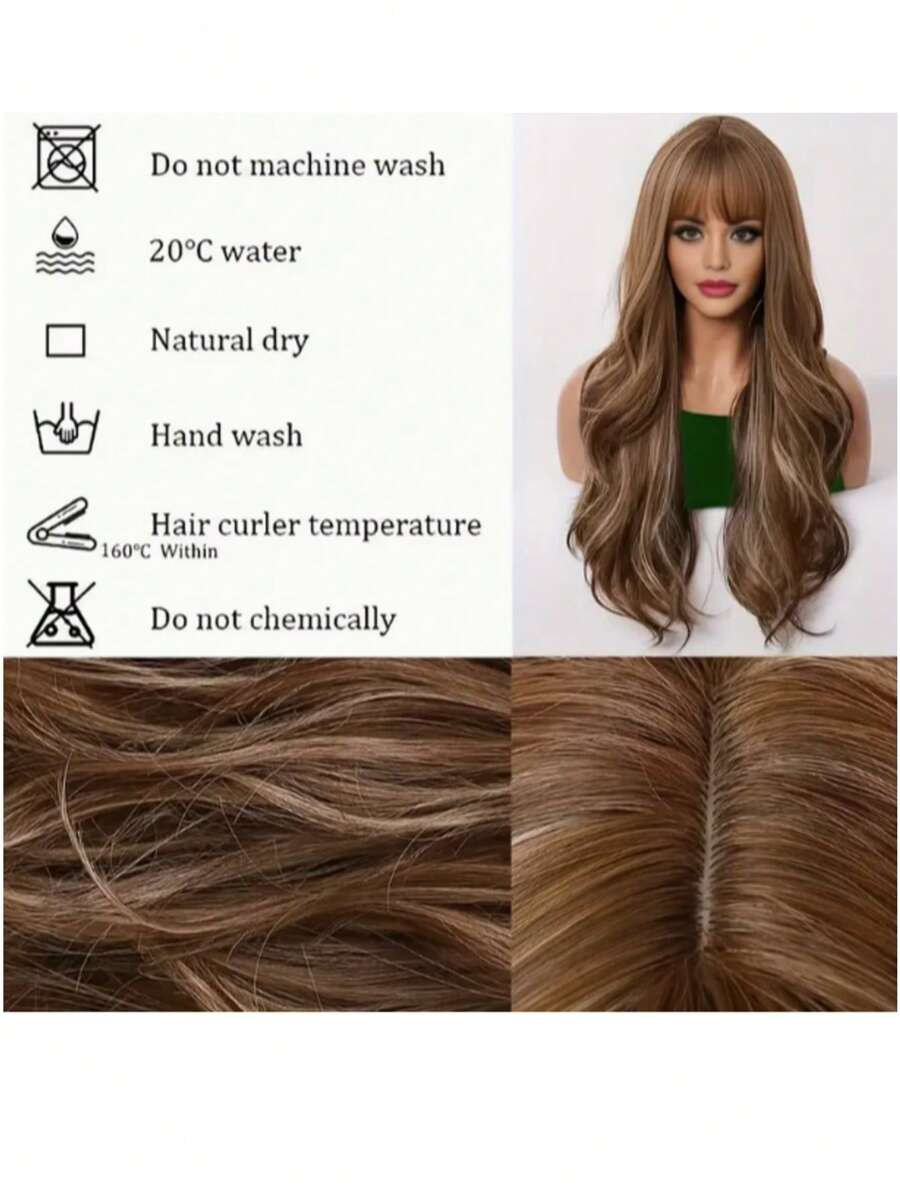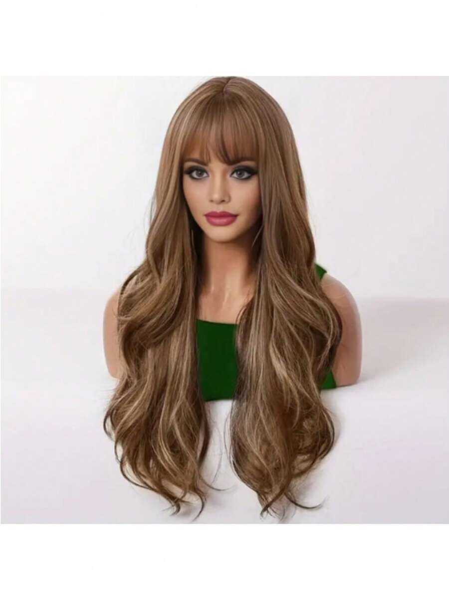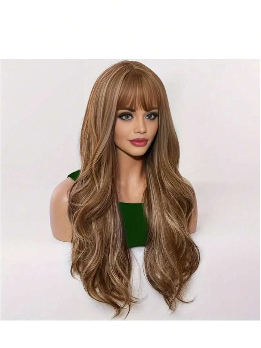 ✨ 28-Inch Elegant Brown Curly Wig with Bangs – Soft, Heat-Resistant Synthetic Wig