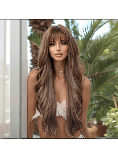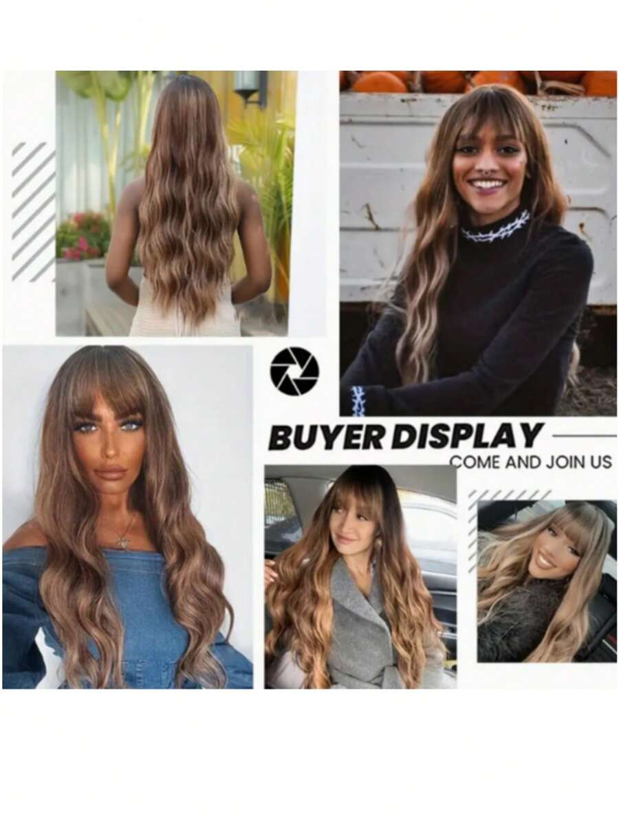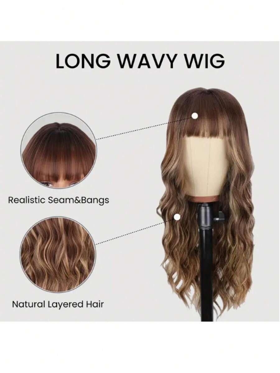 ✨ 28" Long Curly Wig with Bangs – Ombre Brown Synthetic Hair Wig