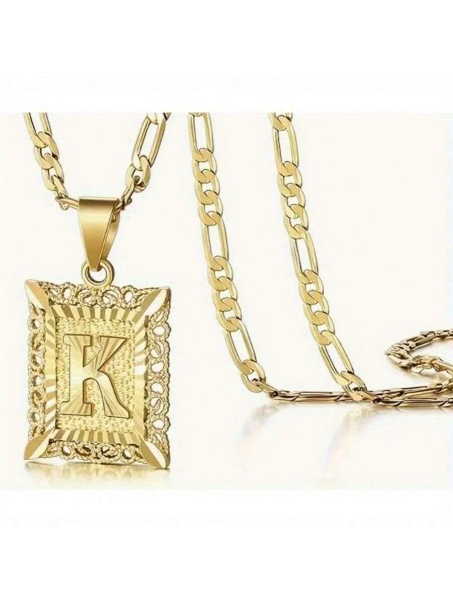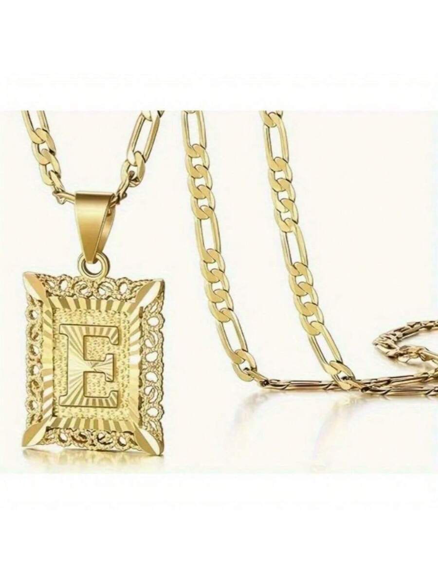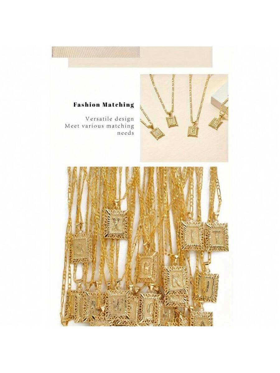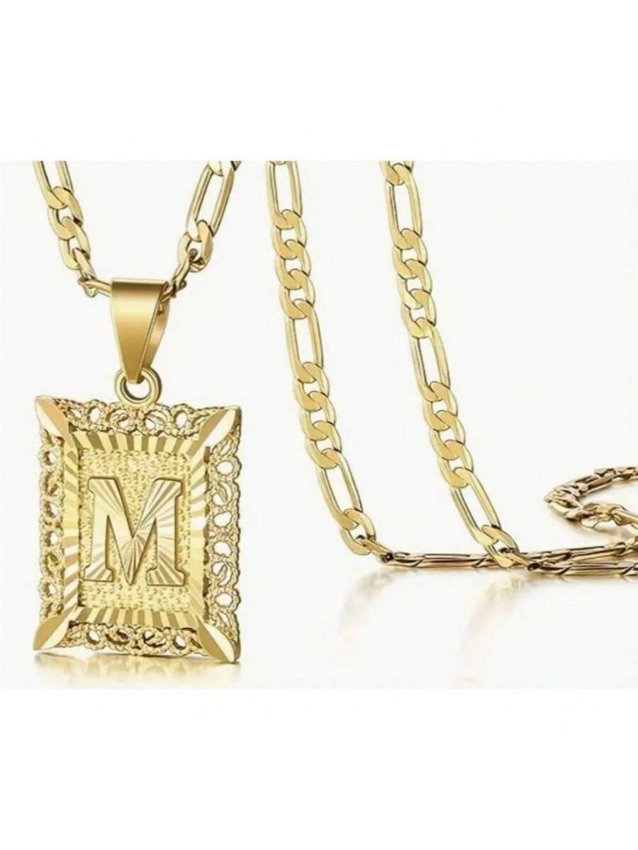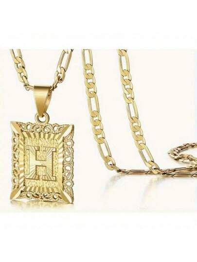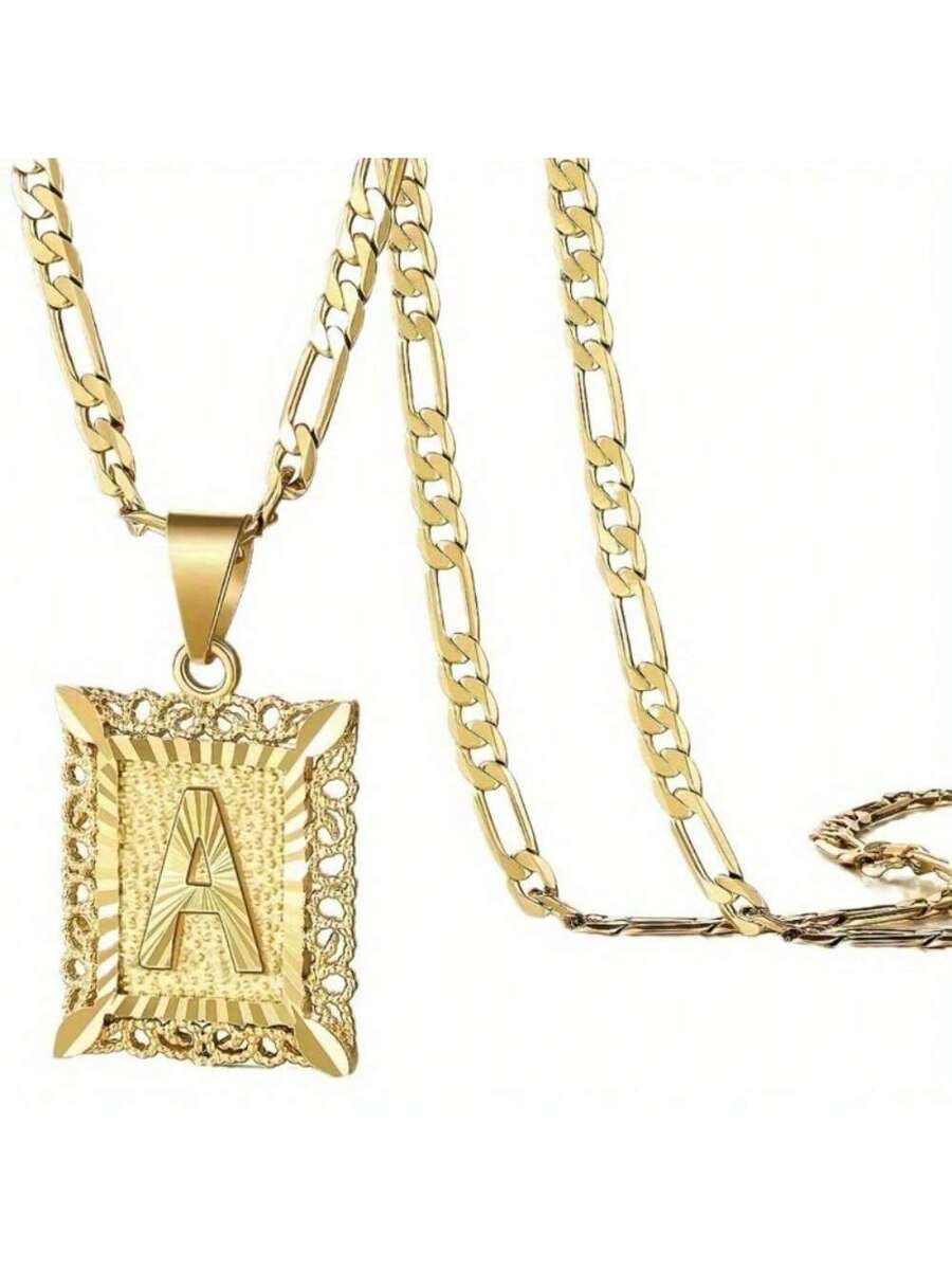 Golden Initial Pendant Necklace A–Z | Unisex Square Letter Necklace with Figaro Chain | Personalized Jewelry Gift